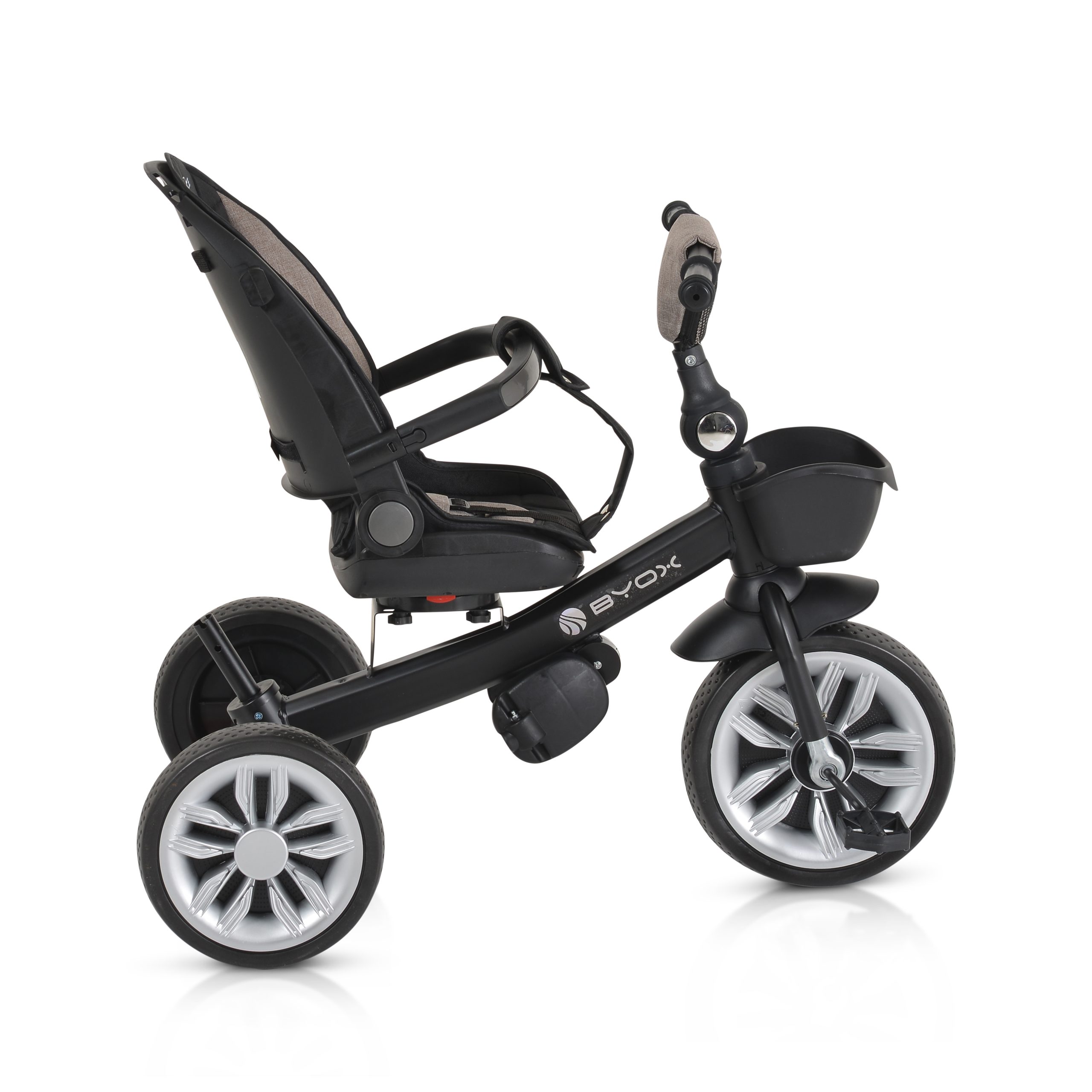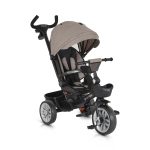 For children above 12 months of age with maximum weight of up to 25 kg. Can be used without the canopy, parent control handle and safety board. Seat: rotating in 360°; Adjustable backrest. Foldable handlebar; Foot rest for smaller children. Parent pushbar – Adjustable, controling the direction of movement of the front wheel. Wheels – EVA wheels. Detachable safety bar. 3-point seat belts. Two rear brakes. Front and rear toy basket. Bottle/ Cup holder.