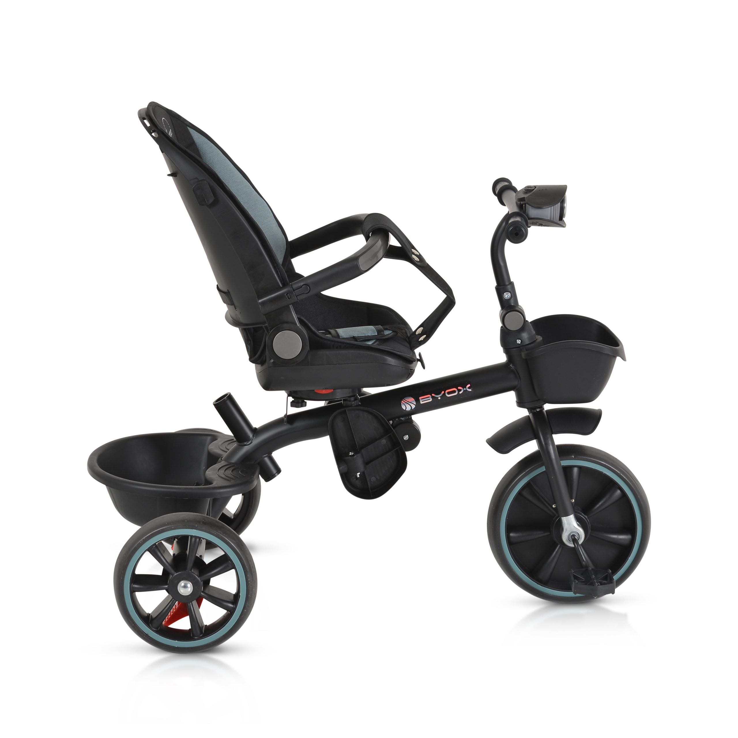 For children above 12 months of age with maximum weight of up to 25 kg. Can be used without the canopy, parent control handle and safety board. Seat: rotating in 360°; Adjustable backrest. Foldable handlebar; Foot rest for smaller children. Parent pushbar – Adjustable, controling the direction of movement of the front wheel. Wheels – EVA wheels. Detachable safety bar. Music tray; 3-point seat belts. Two rear brakes. Front and rear toy basket. Bottle/ Cup holder. Size of the product: Height (up to the heighest point of the parent pushbar) 110 cm x Length 75 cm x Width 52 cm.