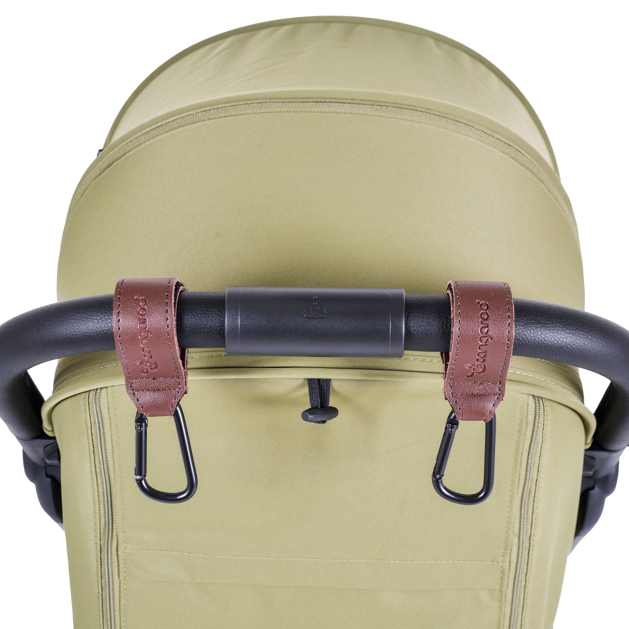 Set of 2 Stroller Hooks. Durable and stylish hooks with metal carabiners and PU leather straps. Securely hold bags up to 10 kg. Compatible with most stroller models. Keep your hands free and make outings easier.