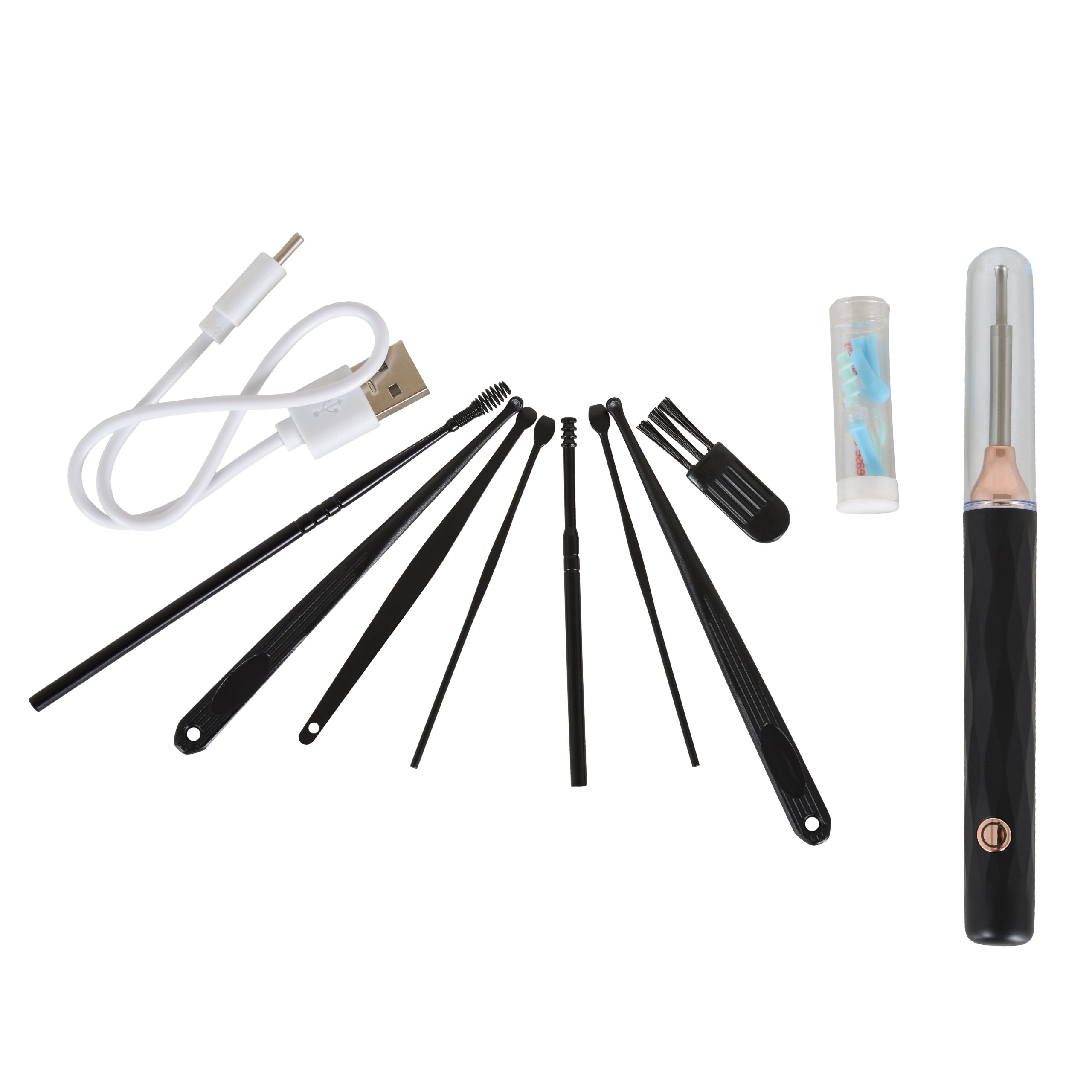 Purpose – for easy and effective cleaning of the earwax of children and adults. The device has several attachments for cleaning and with HD camera for visualization of the ear canal. The camera can be connected to smartphone via a wireless Wi-Fi network and can be controlled with the CooLeer mobile app, which is compatible to iOS and Android. It can also take pictures and record videos in real time. The appliance is with 6 LED lights, which enhance visualization during use. It has a built-in lithium-ion battery that allows up to 90 minutes of operation on a full charge. Focal Length: 1,5 – 2 cm; Depth of Field: 1 – 5 cm; Lens Diameter: 3,5 mm. This appliance is for home use only! The set includes: Digital visible ear scoop; 8 attachments with different shape for easier and effective cleaning of the earwax from the ear; 7 manual cleaning tools; Storage box for the attachments and nozzles; Cleaning brush; USB charging cable type C.