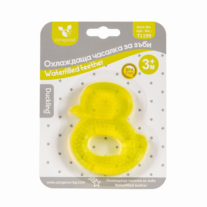 The product is intended for children above 3 months of age. The teether is filled with distilled water. The teether acts as a cold compress for your baby`s gums and helps reducing the discomfort of teething. Place the product in refrigerator and after it is cool enough, please, take it out. The water filled toys should be cooled only in the main compartment of the refrigerator, not in the freezer compartment.