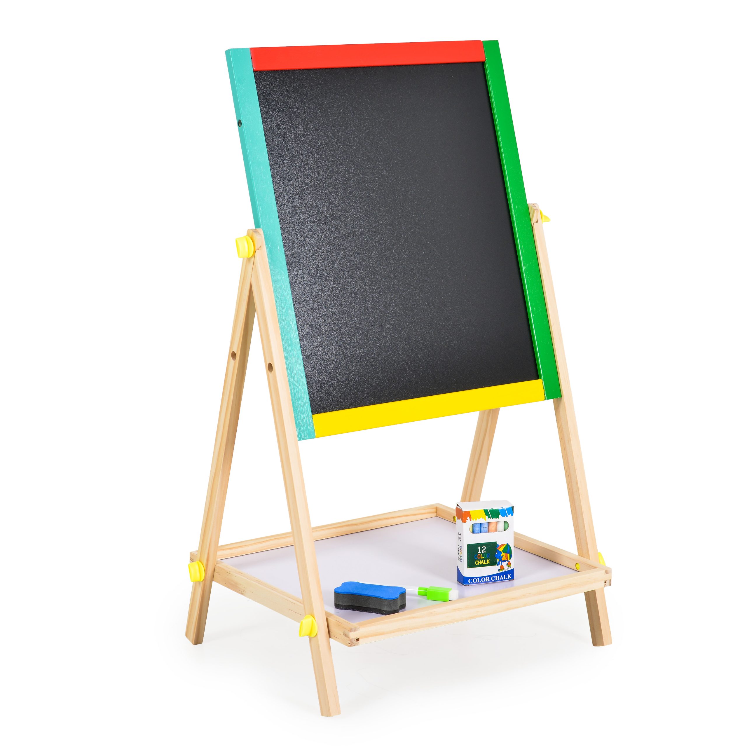 Wooden drawing board including marker, sponge and chalks. The board is double-sided. On one side it is white, for drawing and writing with a marker, and on the other – a blackboard for writing and drawing with chalks. There is a handy accessory holder underneath.