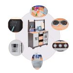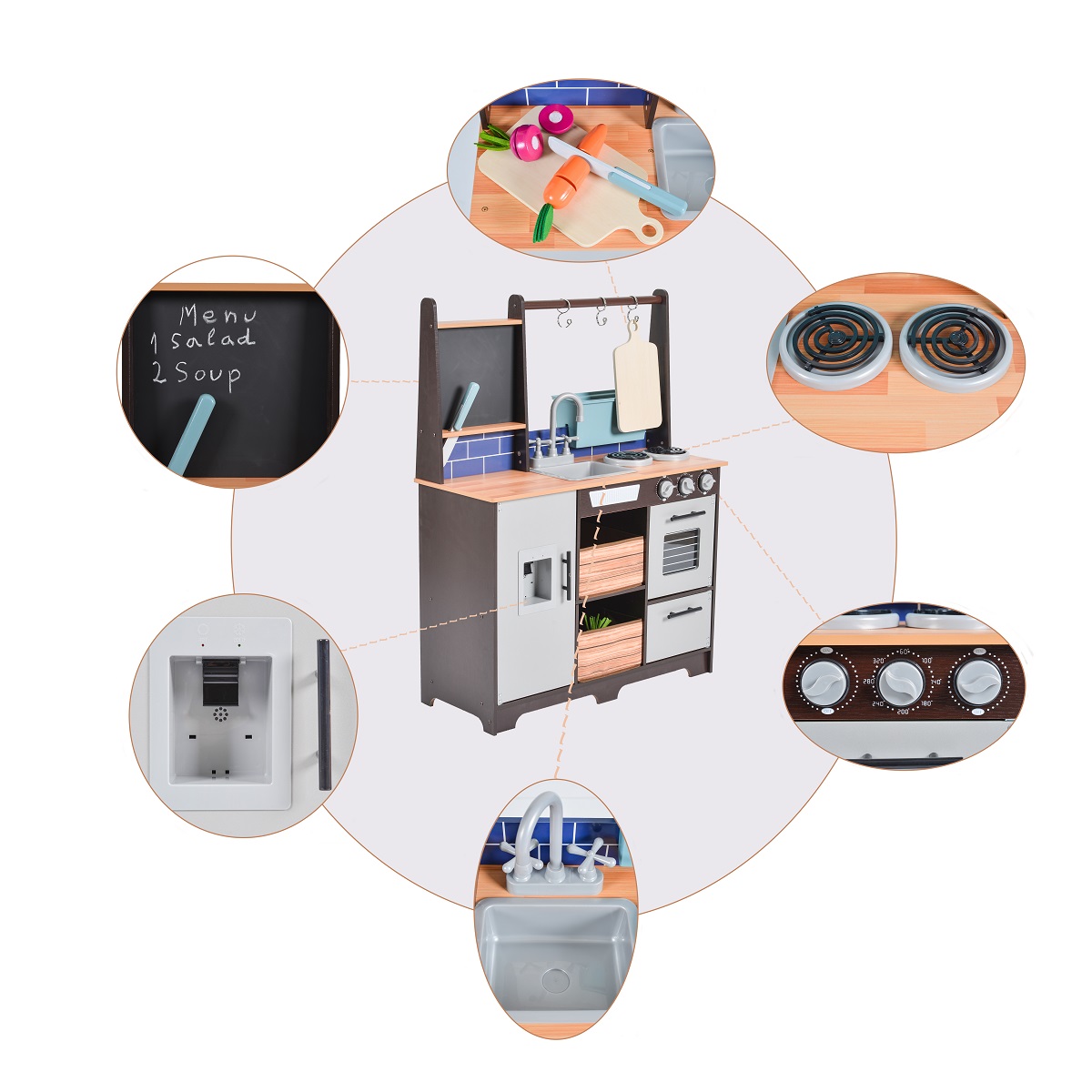 Wooden kitchen Toskana is a nice start for the young chefs.With this kitchen they will have a refridgerator, sink, stoves and oven, cutting board and knife, vegetables and a black board where the daily menu can be written.