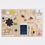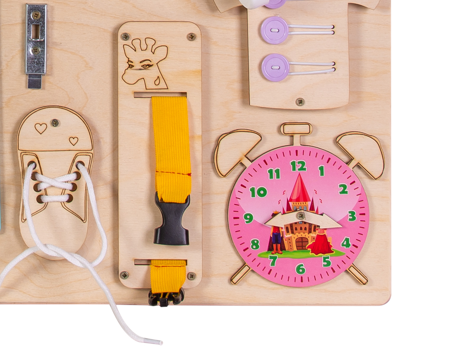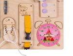 Electronic notebook with a pen, Multicoloured, moving sprockets, ZIP fastener, movable and rotary castors, velcro, two kinds of latch, clock with moving pointers, hook for lock, light switch, padlock with keys, socket with plug, belt with buckle. The wood is poplar and MPP is made from pine.