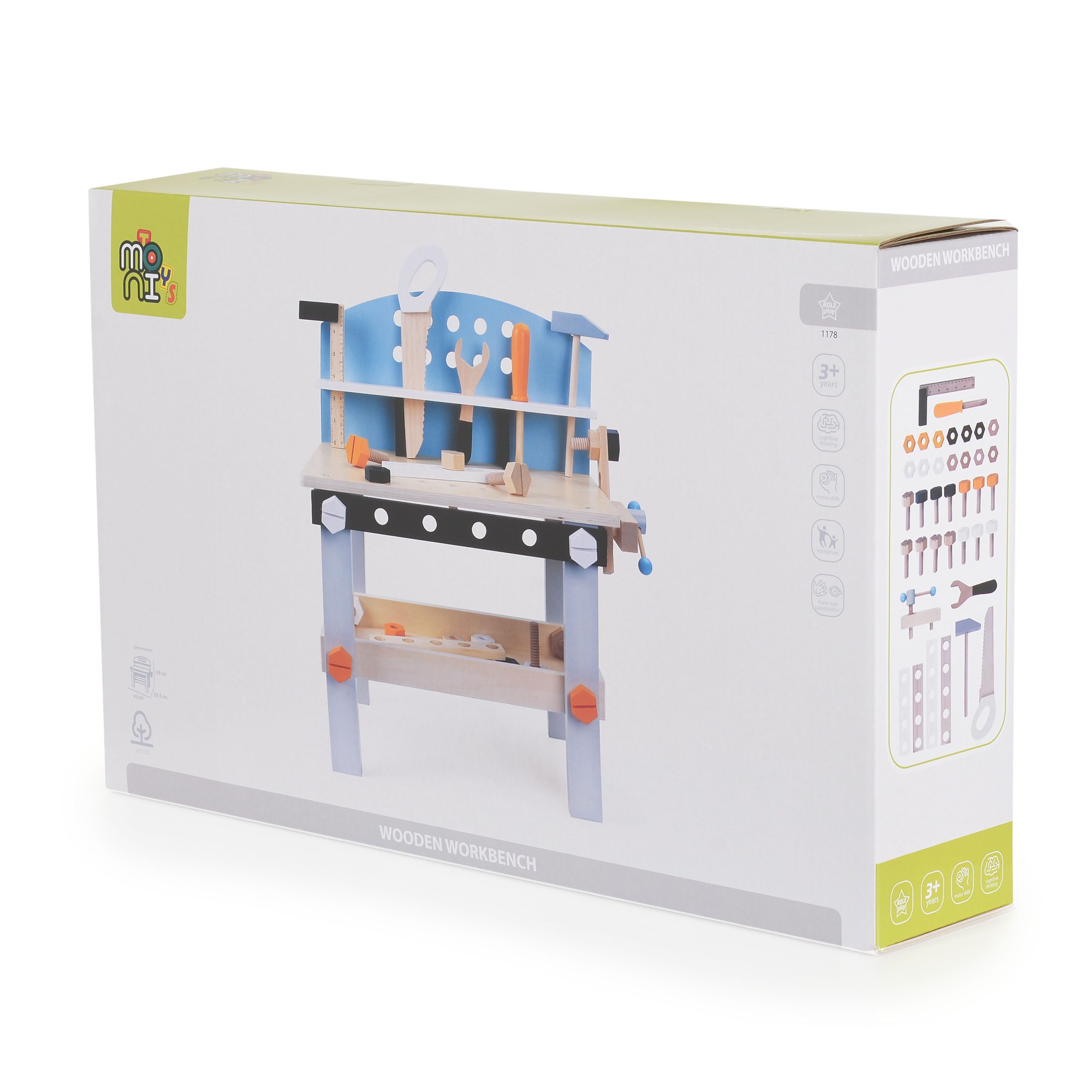 Equipped with a variety of tools and utensils, this wooden table will become a favorite place for young masters to play. It will also help develop fine motor skills and abilities such as dexterity and logical thinking. Color box.